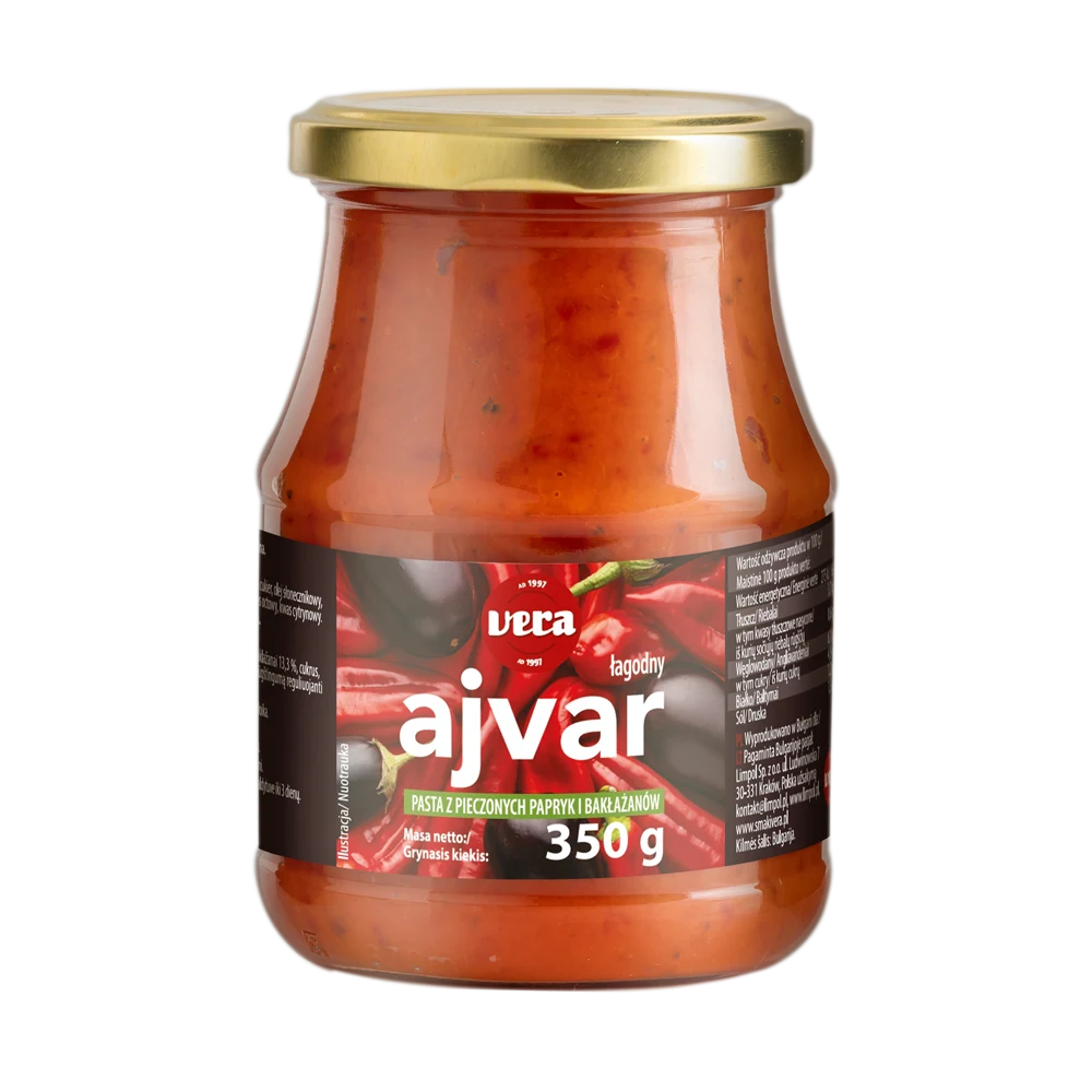 Бренд Ajvar Віра. це унікальна овочева паста, яка принесе на вашу кухню автентичний смак Балкан. Приготована з перцю та баклажанів найвищої якості, вона захоплює своєю натуральністю та насиченим ароматом. Завдяки своєму традиційному рецепту, айвар є чудовим доповненням до багатьох страв, підсилюючи їх смак та надаючи їм неповторного характеру. Ідеально підходить як паста для бутербродів, яка збагатить ваш щоденний сніданок або перекус, а також як доповнення до м'яса та страв на грилі, ідеально поєднуючись з різноманітними смаками.