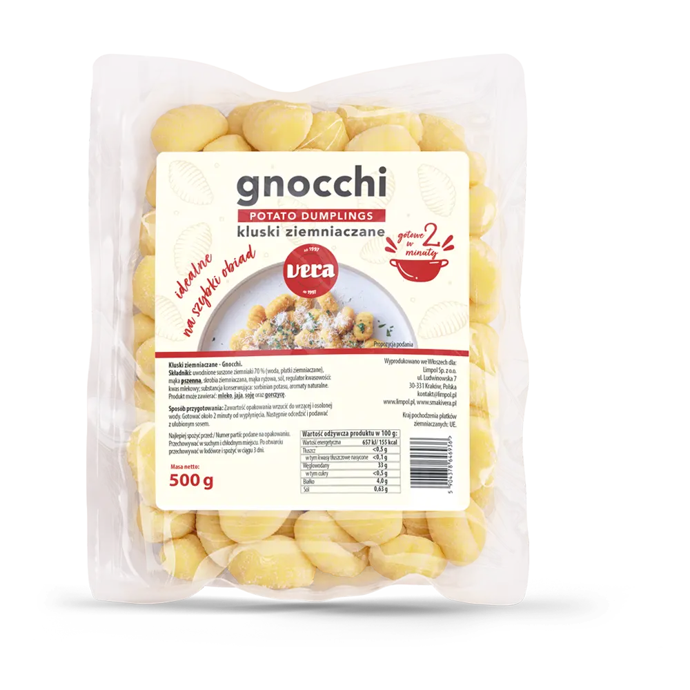 Ньоккі - це італійська картопляна локшина з багатогранним смаком. Готові до вживання, вони потребують лише кількох хвилин у киплячій воді або на сковороді. Вони чудово підходять для швидкої страви з простим соусом або як доповнення до м'яса, заправленого вершковим маслом чи оливковою олією. Наші ньокки мають простий склад і також є чудовим варіантом їжі для дітей. Все, що вам потрібно зробити, це додати оригінальний гарнір - і смачна вечеря готова. Ми рекомендуємо.